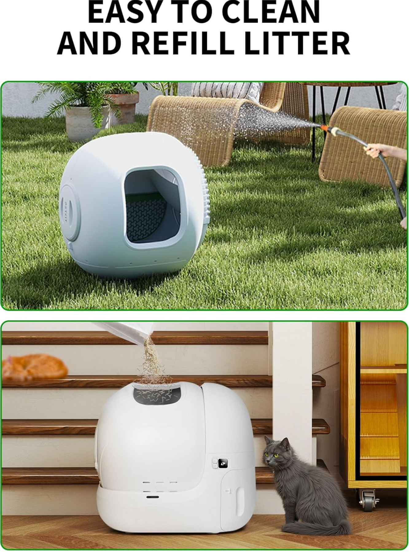 - HANDS-FREE AUTOMATIC CLEANING CAT LITTER BOX: 15 days(one cat) of no scooping, suitable for cats weighing more than 3.3lbs and older than 6 months.